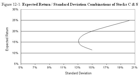 It can be seen from the above table that at some combinations, the risk per unit of return is less than others, and it is also less than if all the funds were invested in one stock. The reason for this is the correlation that is less than one. Whenever the correlation between two stocks is less than 1.0, there would be benefits of diversification. As the correlation between two assets decreases, there is less of a tendency for stock returns to move together. There separate movements of each stock serve to reduce the volatility of a portfolio to a level that is less than that of its individual components. By diversifying a portfolio across many stocks, it is possible to create portfolios with higher expected returns without increasing risk (standard deviation).