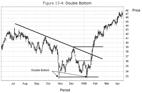 It occurs when a stock price drops to a similar price level twice within a few weeks or months, the double-bottom pattern resembles a “W". You should buy when the price passes the highest point in the handle. In a perfect double bottom, the second decline should normally go slightly lower than the first decline to create a shakeout of jittery investors. The middle point of the “W” should not go into new high ground. This is a very bullish indicator. The belief is that after two drops in the stock price the jittery investors are out and long-term investors are still holding on. The reverse of this pattern is called a “Double Top”. An example is illustrated graphically as follows:
