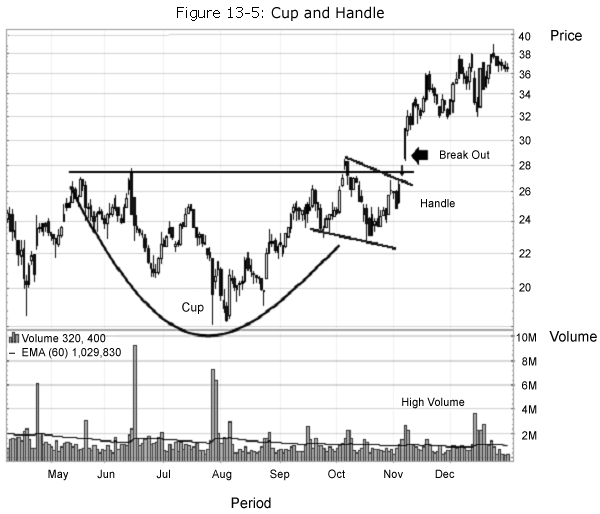 This is a pattern on a bar chart that can be as short as 7 weeks and as long as 65 weeks. The cup is in the shape of a U. The handle has a slight downward drift. The right hand side of the pattern has low trading volume. As the stock comes up to test the old highs, the stock will incur selling pressure by the people who bought at or near the old high. This selling pressure will make the stock price trade sideways with a tendency towards a downtrend for 4 days to 4 weeks, and then it takes off. It looks like a pot with handle. Investors have made a lot of money using this pattern, which is one of the easier to detect. An example is illustrated graphically as follows: