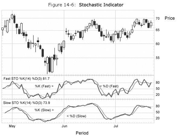 When a trend is upward there is a tendency that the close price will be very close to that day's high. During a downward trending market there is a tendency that the close price is closer to the low price. The Stochastic Indicator helps to find trend reversal by searching for a period when: the close prices are close to low prices in an upward trending market; or close prices are close to high prices in a downward trending market. This formula has two output values: %K - Simple Stochastic Indicator and %D - Smoothed Stochastic Indicator (Moving Average of %K). An example is illustrated graphically as follows:
