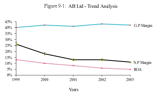 The above graph is developed using gross profit margin, net profit margin and return on assets. It clearly demonstrates that AB Ltd is experiencing a deterioration of the bottom-line over the five year period despite the remarkable growth in turnover and marginal improvement in gross profit margins.